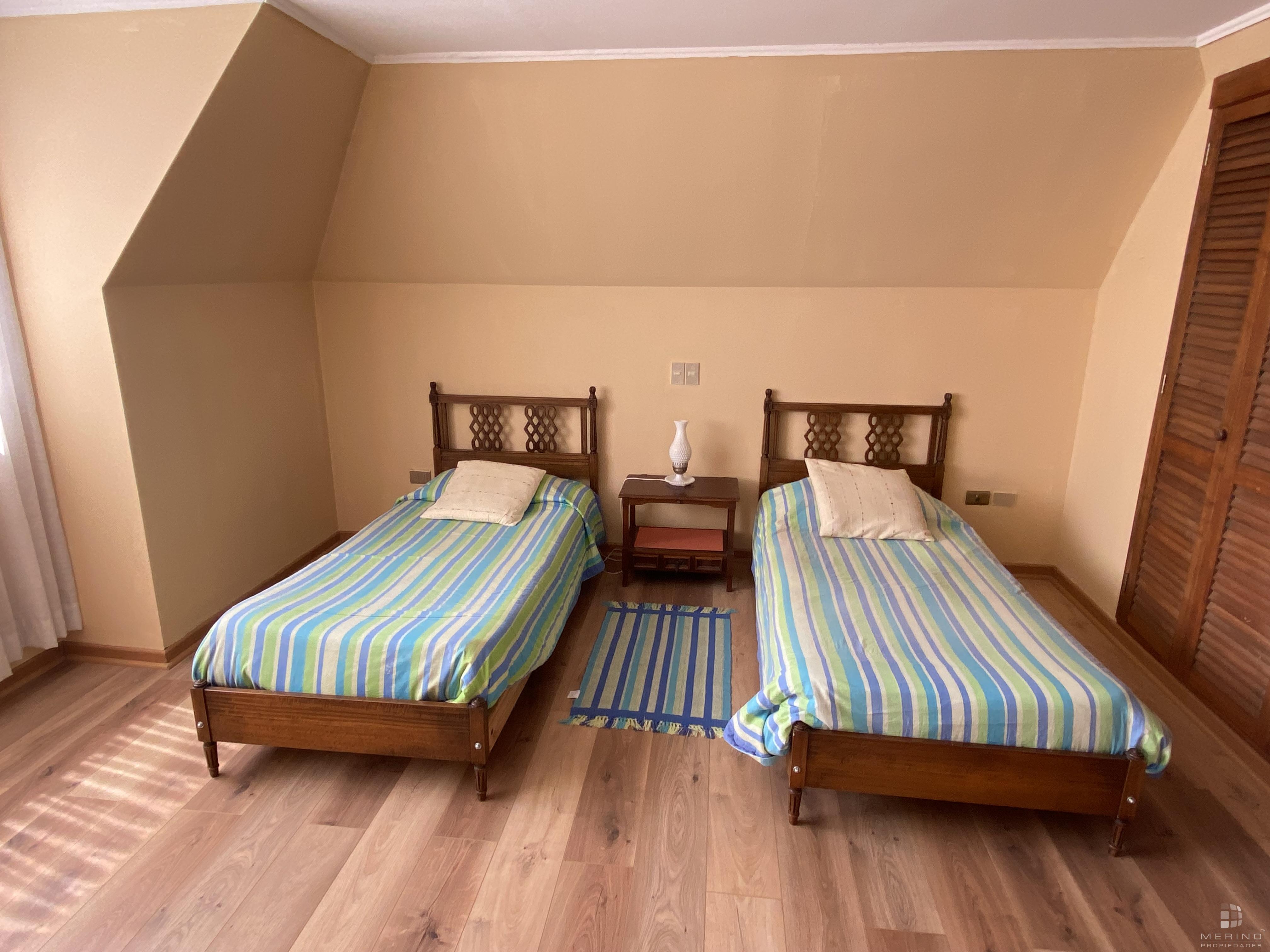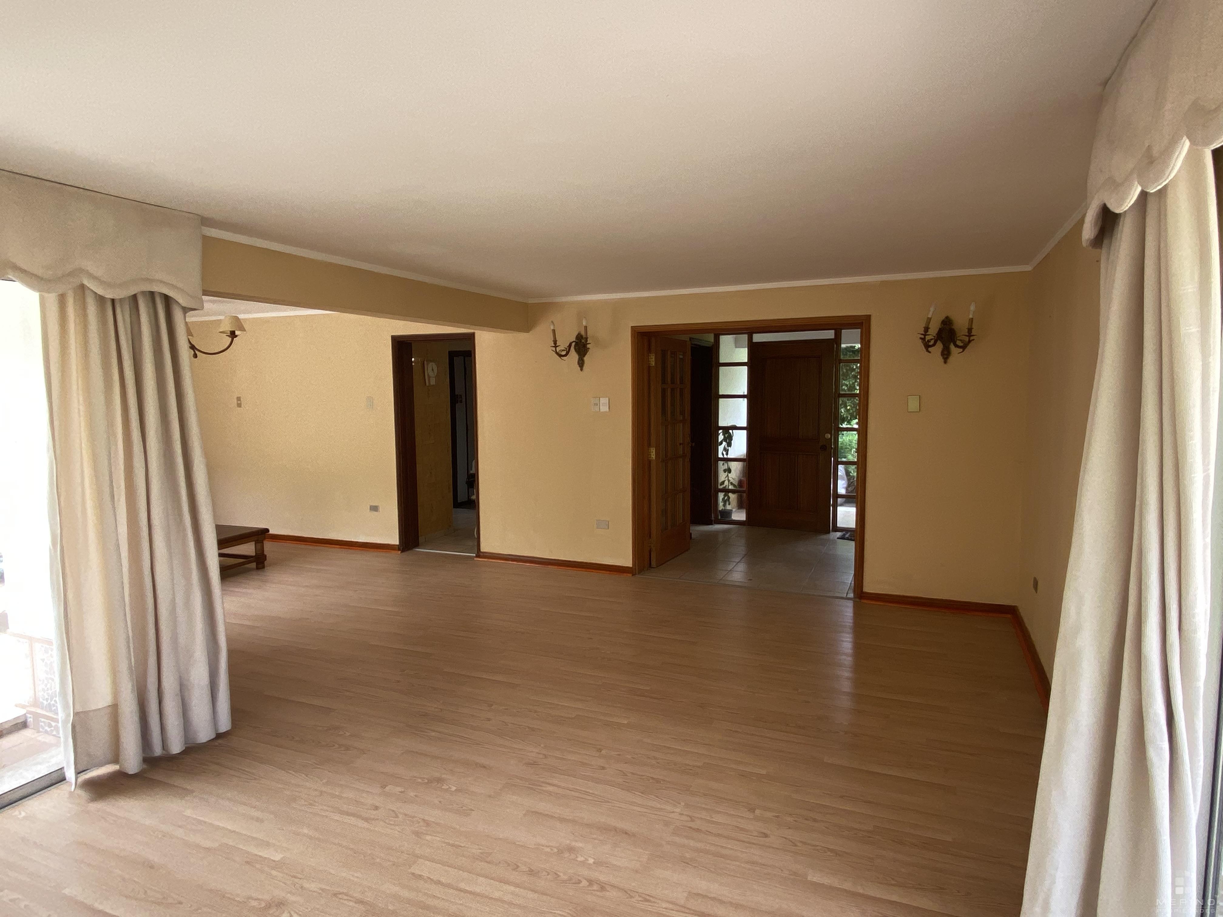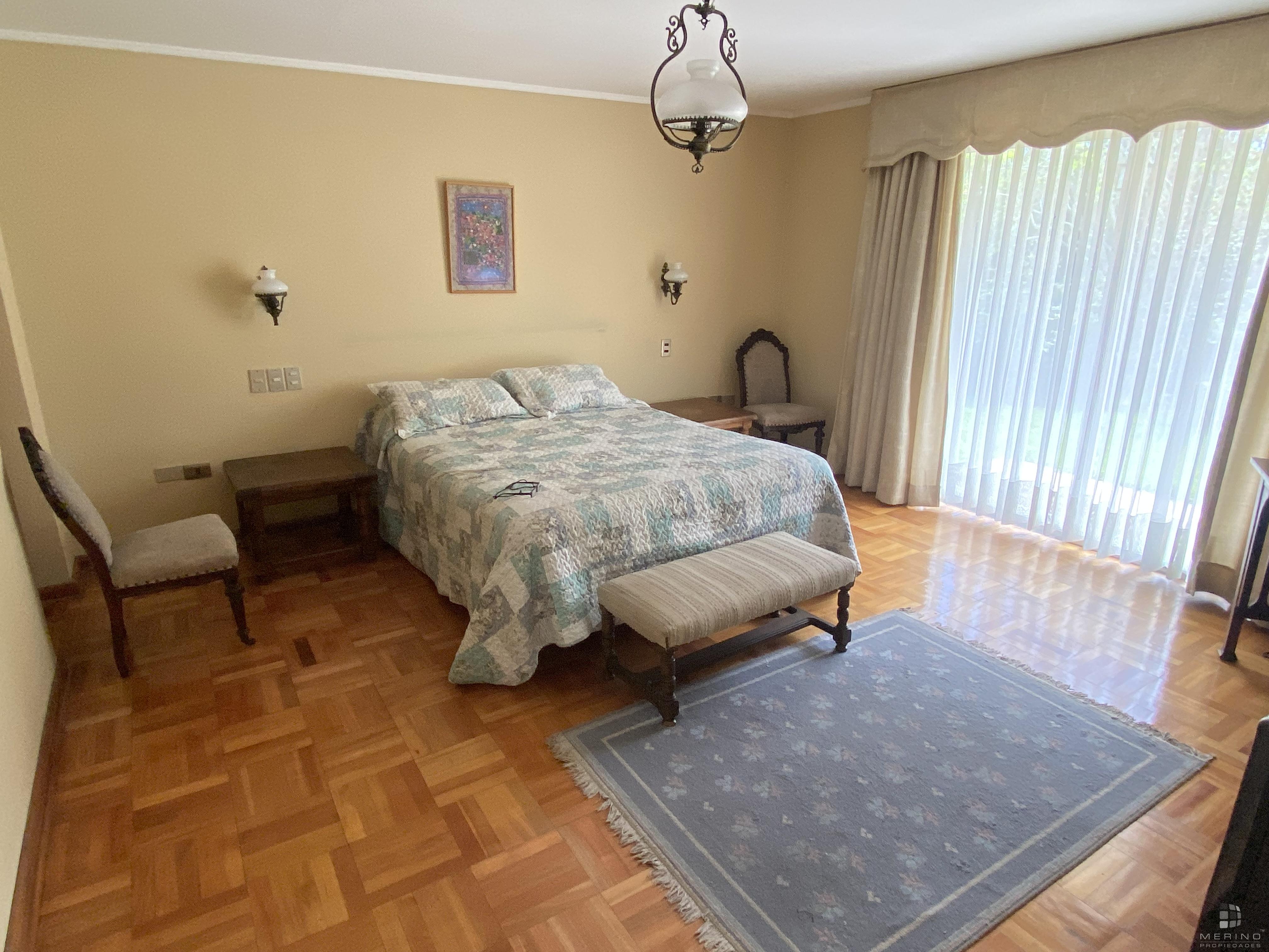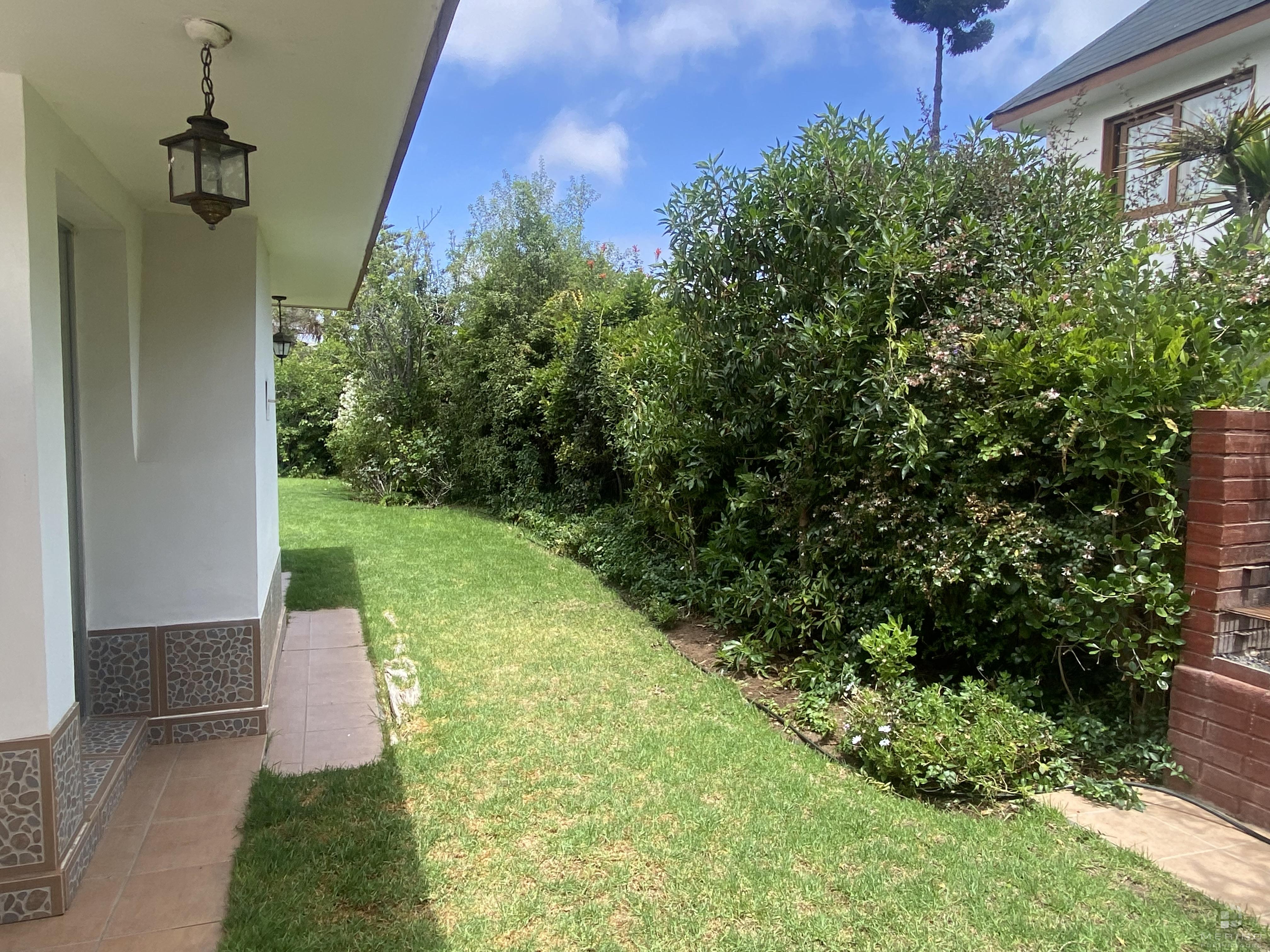 Amplia propiedad en condominio, dos pisos, 5 dormitorios, 4 baños, mas área de servicio con dormitorio y baño, agradable cocina cerrada amoblada, living y comedor en dos ambientes y con piso de parquet, recibidor, sala de estar, lavandería, lindo patio y antejardin con estacionamiento para 3 vehículos.